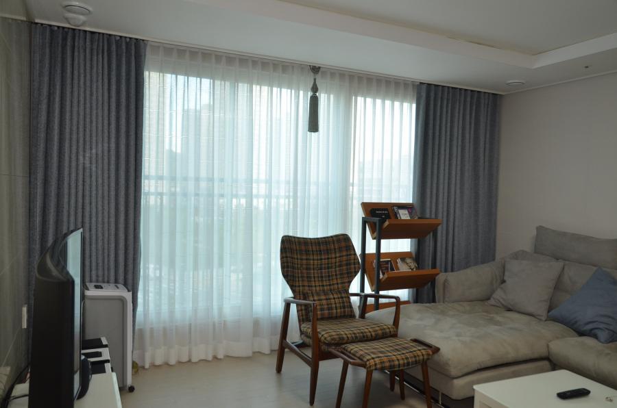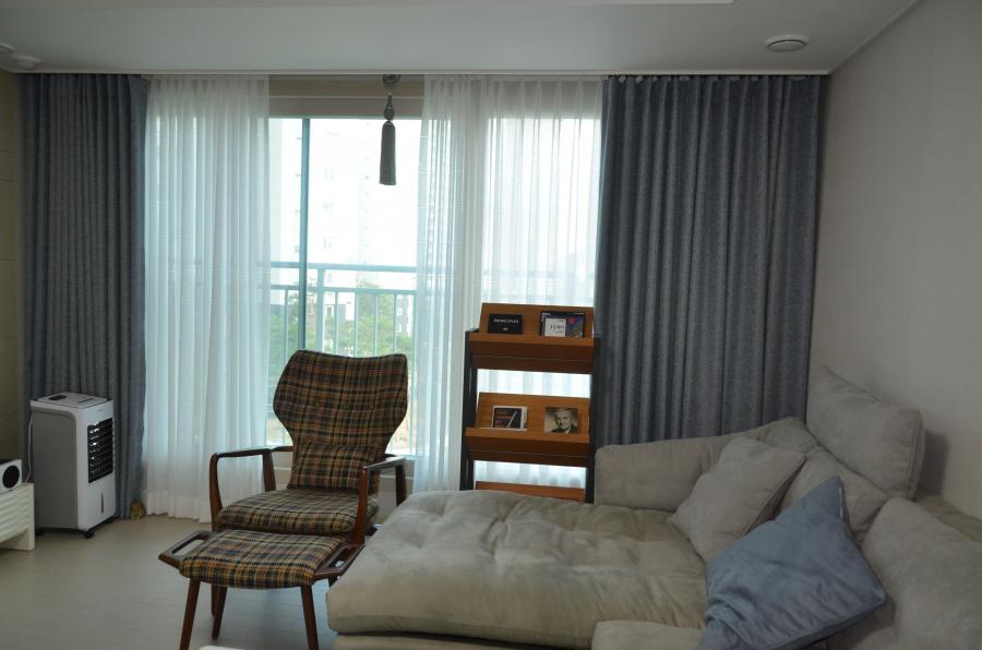 겉 커튼은 밝은 그레이칼라와 딥 블루를 투톤으로 매치시켜 드렸어요~
